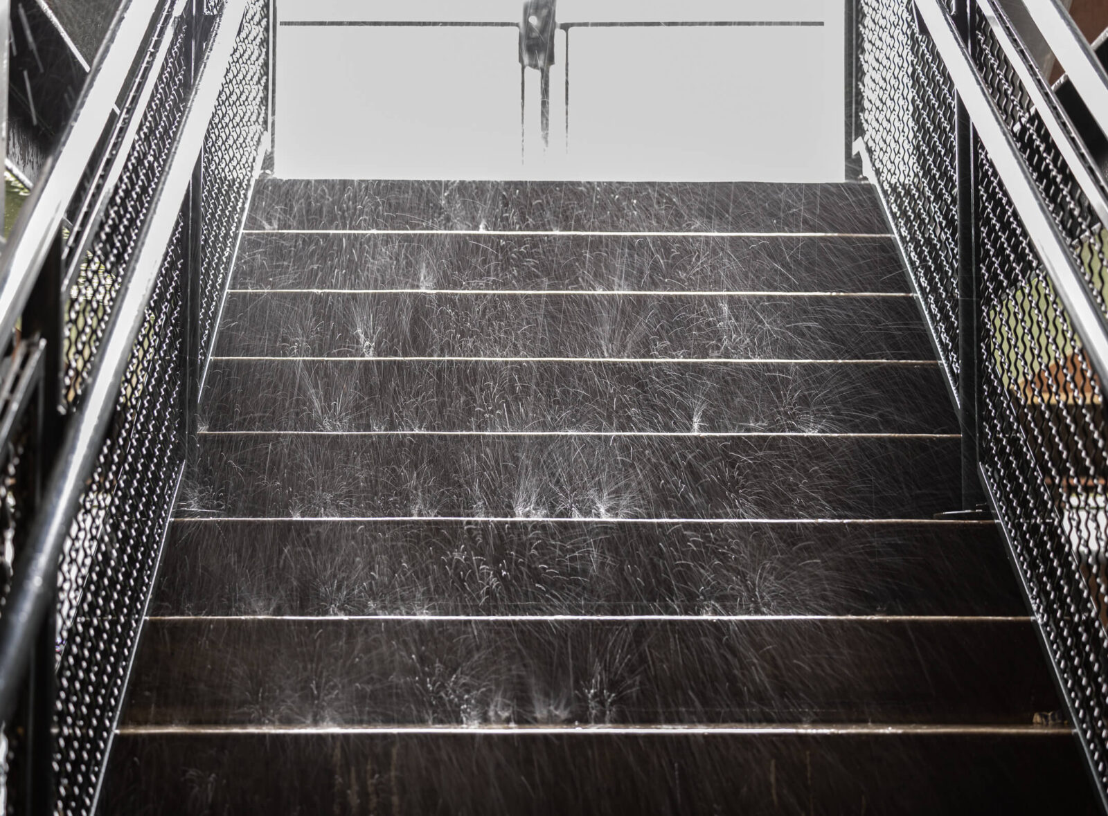 A small group of us made our way to see if the pitchers were warming up. The area was directly below our balcony so we had to be VERY careful to not hold anything that could potentially fall onto the players-no hats, lens hoods, sunglasses, anything. Just as we started shooting, the sky shifted, dark clouds rolled in and the first raindrops started to fall. Within minutes, the grounds crew began pulling the tarp across the infield. There was no way I was going to stop shooting, a few of us stayed in the pouring rain getting shots until we were too soaked to continue. I was lucky enough to be paired up with workshop instructor and talented SF Giant photographer, Andy Kuno. He helped me take notice of the amount of water coming into the stadium as a unique photo opportunity.